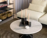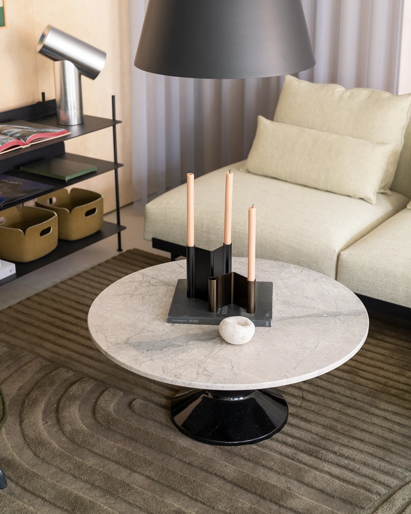 Midst-sohvapöytä Ø90 on muotoiltu painottaen mittasuhteita ja vakautta. Pyöreä pöytälevy lepää keskelle sijoitetun jalan varassa, mikä luo harkitun ja eheän ilmeen – painopiste pysyy lähellä lattiaa ja muoto tuntuu turvalliselta osalta tilaa.
