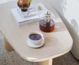 Orgaanisesti muotoiltu pöytälevy luo pehmeän ja tasapainoisen ilmeen, kun taas tammenviilusta ja massiivitammesta valmistettu rakenne tuo vakautta ja lämpimän puutuntuman.