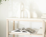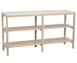 Materiaali: kansi massiivista italialaista Travertiini-kiveä. Jalat ja runko massiivitammea, hyllylevy tammiviilutettu MDF. Puupinta on lakattu.