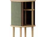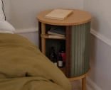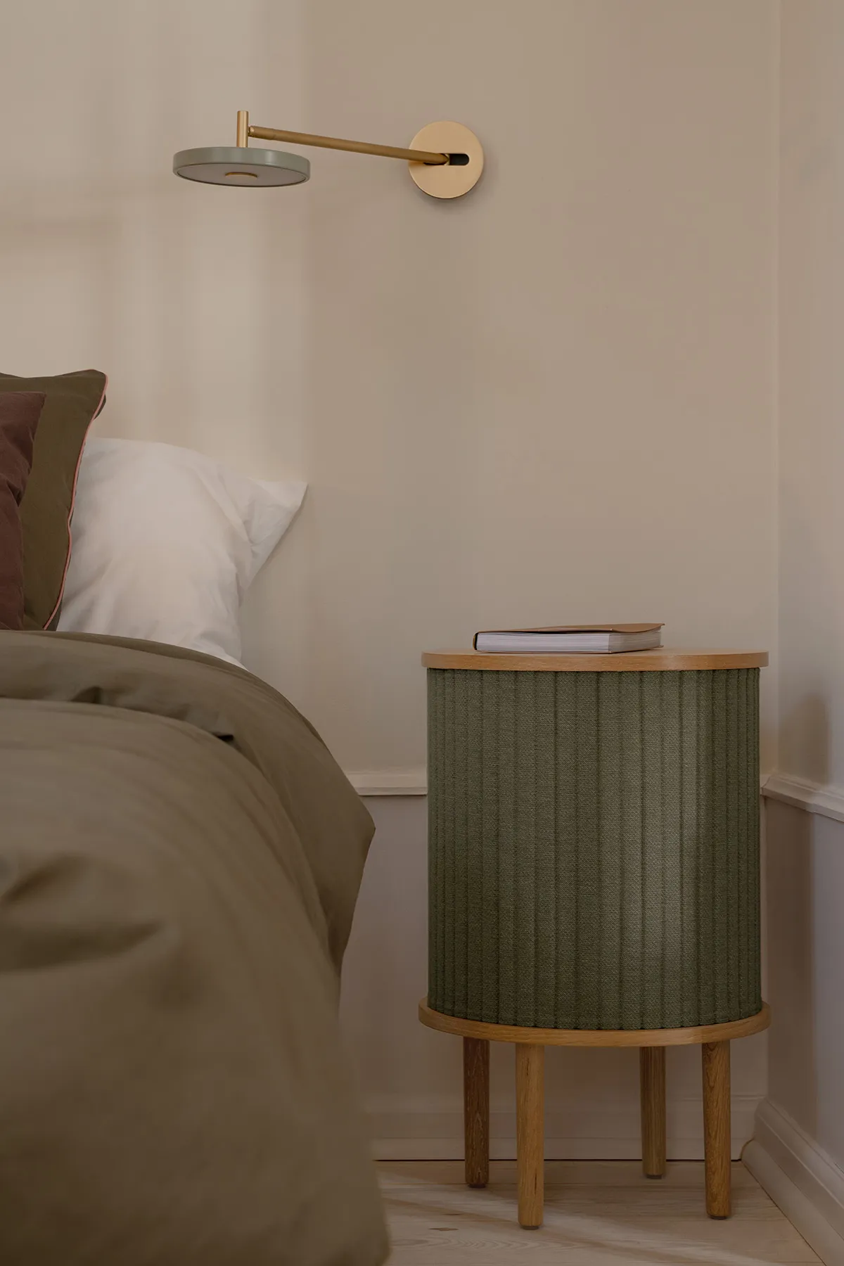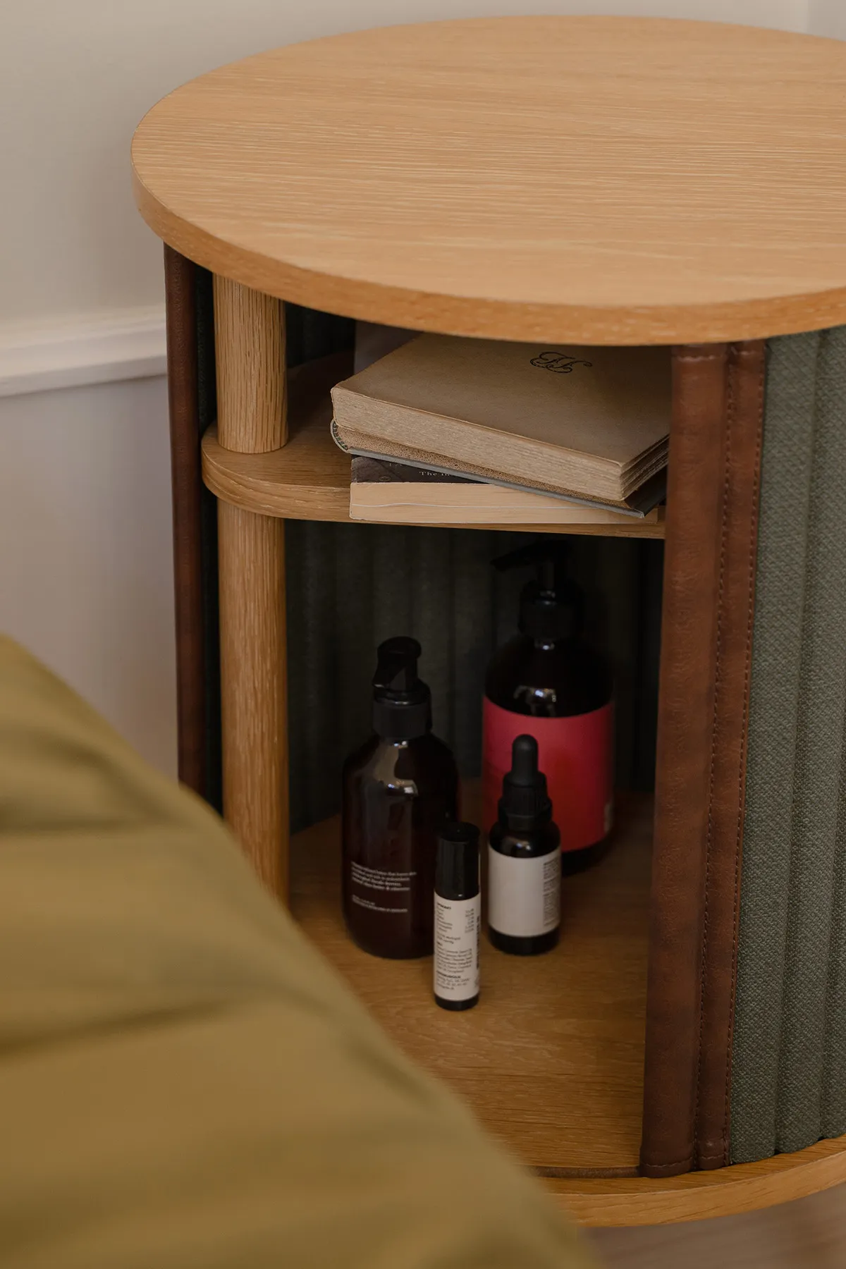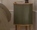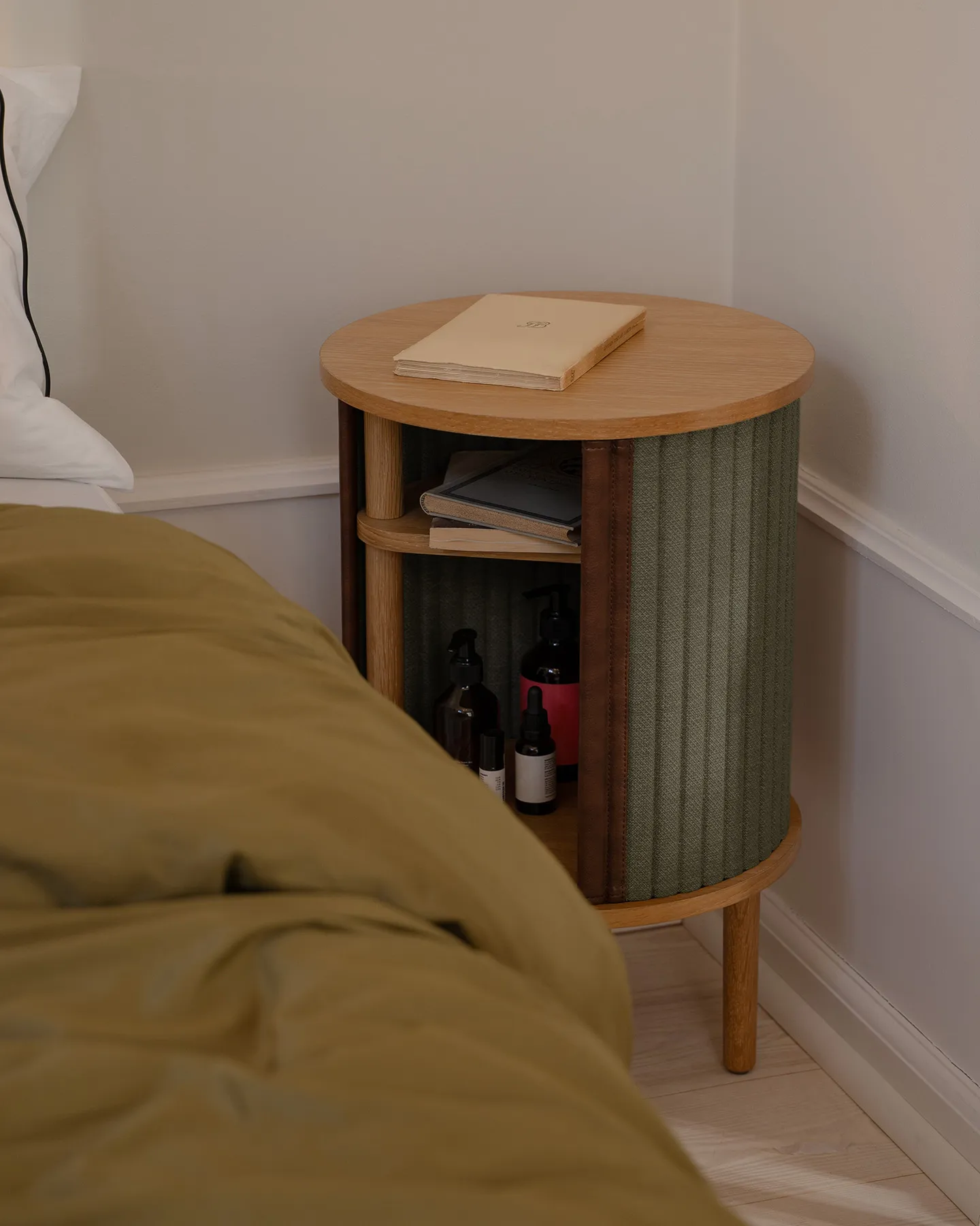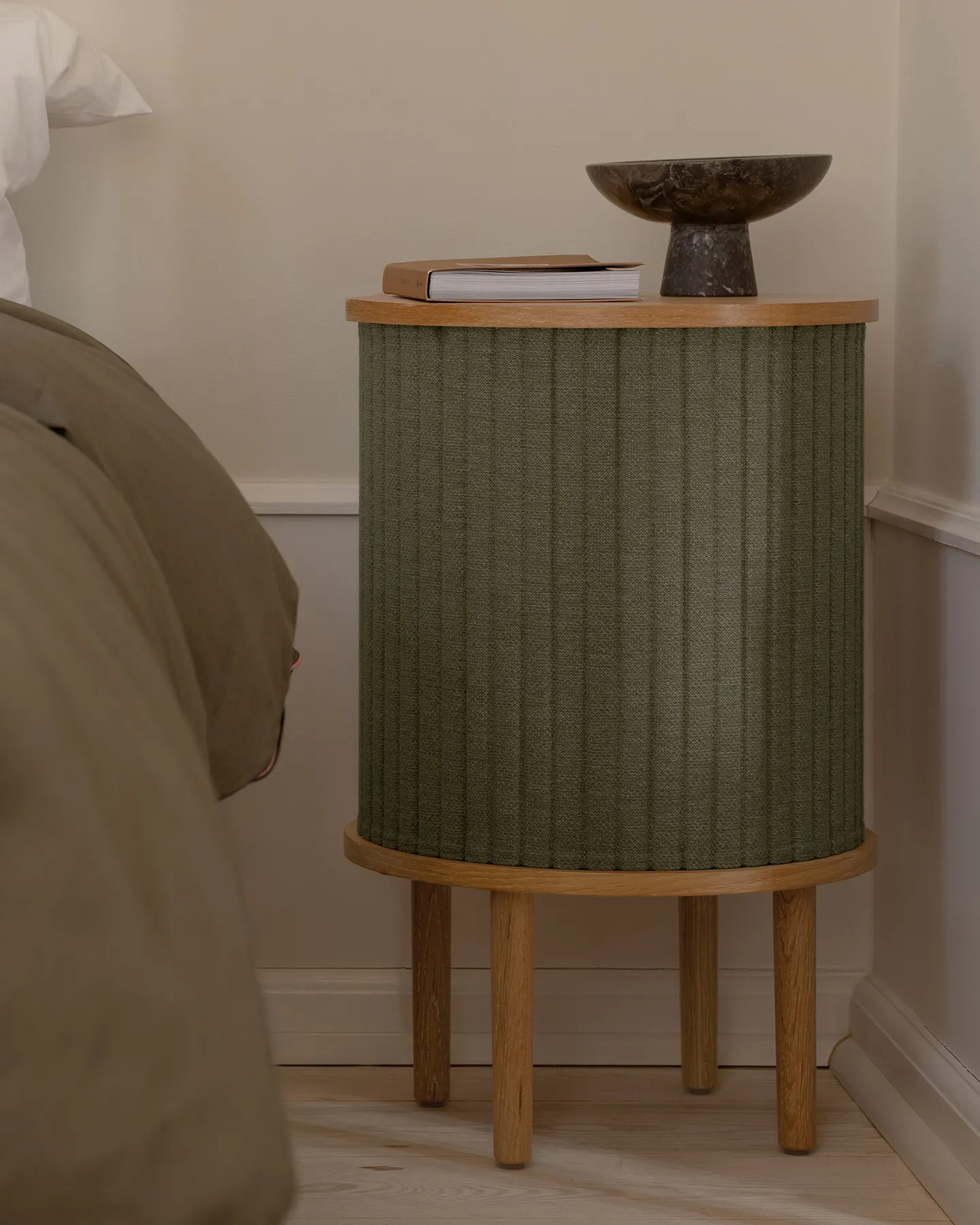 Audacious-sivupöytä on Jonas Søndergaardin suunnittelema, ja se on käytännöllinen lisä olohuoneeseen, makuuhuoneeseen tai eteiseen. Tekstiiliovet liikkuvat kalusteen pyöristetyn muodon mukaisesti ja kätkevät sisäänsä lokeron, jossa on hylly – suunniteltu sekä pientavaroille että korkeammille esineille, kuten kirjoille tai aikakauslehdille.