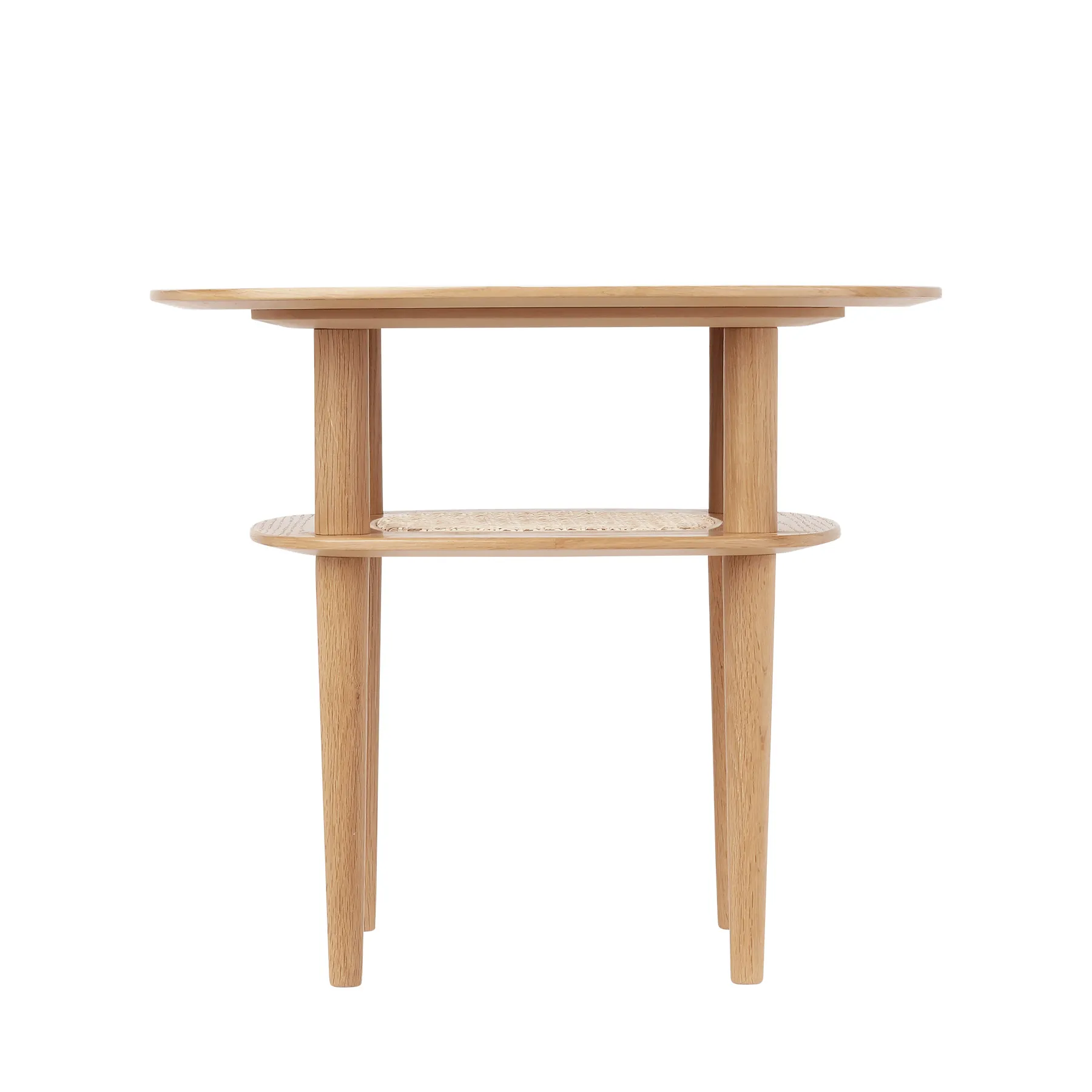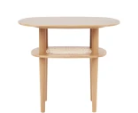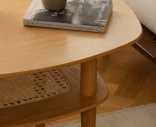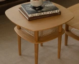 Pöytälevyn alla on luonnonrottinkinen hylly – ihanteellinen kirjojen, lehtien tai pientavaroiden säilyttämiseen käden ulottuvilla. Luonteva valinta pieneen olohuoneeseen, sivupöydäksi tai lounge-tiloihin, joissa mukavuus ja tyyli kulkevat käsi kädessä.