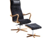 Furiren-nojatuoli toimii kaikissa asennoissa, kiitos keinu- ja pyörimistoimintojen sekä irrotettavan niskatyynyn. Kauniista yksityiskohdista ja upeasta lampaannahkaverhoilusta vastaa huonekalusuunnittelija G.A. Berg.