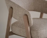 Näkyvä puurunko nousee jaloista käsinojaan asti, mikä antaa tuolille selkeän rakenteen ja korostaa pehmeän ja vankan materiaalin välistä kohtaamista. Materiaalien yhdistelmä luo tasapainoisen ilmeen ja tekee tuolista luontevan katseenvangitsijan huoneessa.