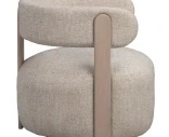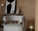 Istuin on syvä ja matala, mikä luo rennon istuma-asennon, jossa keho saa painua kunnolla paikoilleen. Verhoiltu muoto rakentaa pehmeää volyymia, kun taas metallirunko tuo vakautta ja pitää rakenteen tukevana vuodesta toiseen.