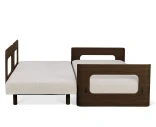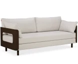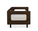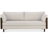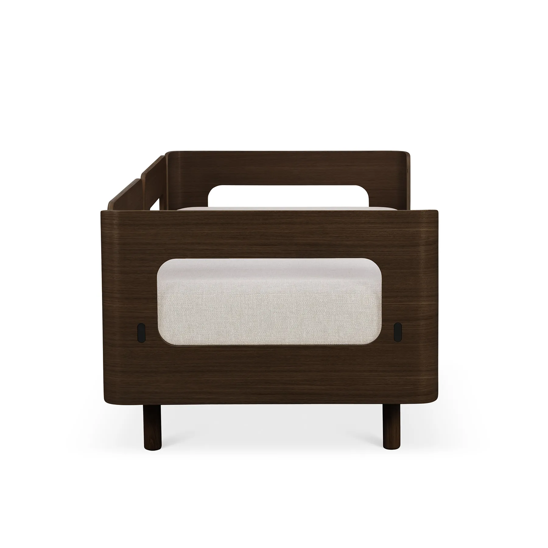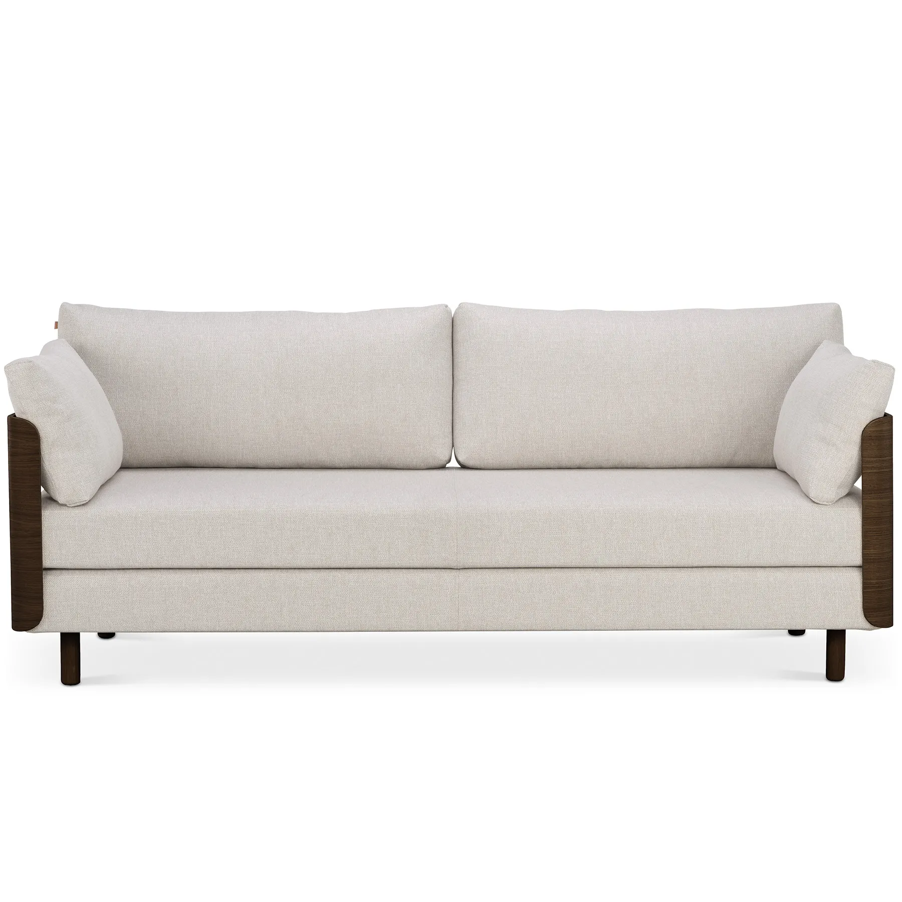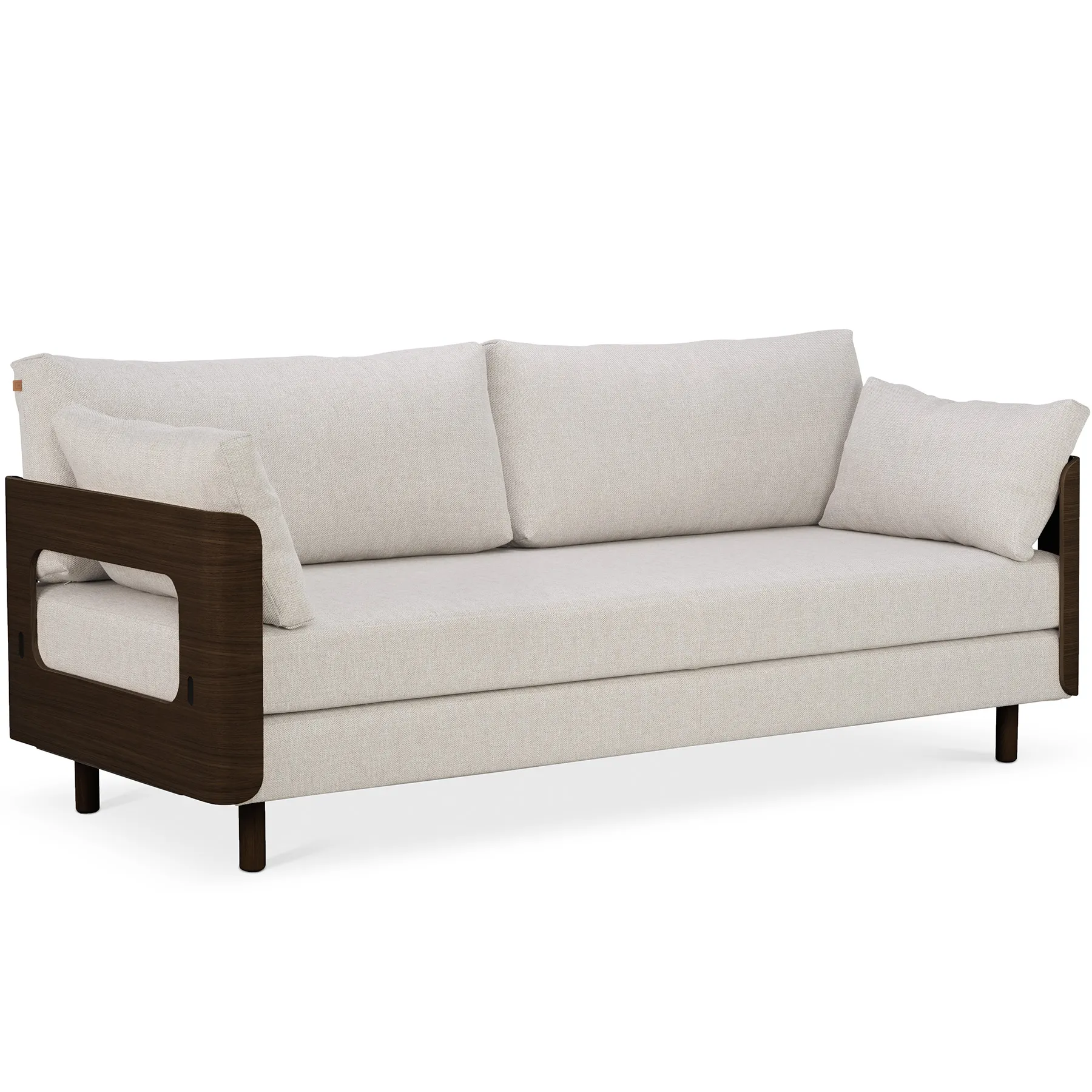 Rakenne perustuu kahteen erilliseen runkoon, jotka yhdessä muodostavat vakaan vuodratkaisun. Runko yhdistää koivuvanerin ja laminoidun tammivanerin, ja puuosissa on tumma tammiviimeistely, joka tuo tilaan lisää syvyyttä ja kontrastia. Istu- ja selkätyynyt on pehmustettu vaahdolla ja polyesterikuidulla, mikä antaa tasaisen tuen sekä sohva- että vuodeasennossa.