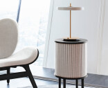 Tuolissa on päivitetty verhoilu 100% kierrätettyyn Horizons-kankaaseen. Samalla tuolissa aiemmin esiintynyt tikkauskuvio poistui. Verhoilu on vaihdettava joten voit halutessasi uusia pelkästään kangaspäällystetyn istuinosan ja selkänojan.