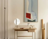 Luna on näppärä työpöytä massiivitammesta – tässä versiossa sekä hyllyllä että pyöreällä peilillä. Kaunis ja toimiva ratkaisu, joka sopii täydellisesti meikkauspöydäksi, työskentelypaikaksi tai sivupöydäksi eteiseen.