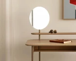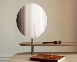 Tämä Luna-työpöydän versio yhdistää käytännöllisyyden ja persoonallisuuden. Pöytälevyn alle integroitu laatikko ja takareunan hylly (110 x 15 cm) täydentyvät tässä mallissa 35 cm halkaisijaltaan olevalla pyöreällä peilillä.