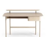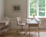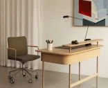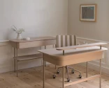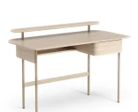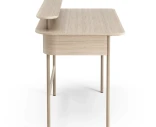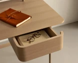 Pöytä on valmistettu massiivitammesta ja viimeistelty huolellisesti valituilla sävyillä lakatulla pinnalla. Pöytälevyn alle integroitu laatikko pitää tarvittavat tavarat järjestyksessä ja helposti saatavilla – mutta poissa näkyvistä. Puun ja jauhemaalatun teräksen yhdistelmä luo ilmavan ja tasapainoisen ilmeen, joka sopii useimpiin tiloihin.