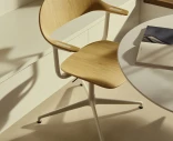 Mynt-tuoli puukuorella on tuolin aistikkaampi versio – muotopuristettu tammiviilu tuo lämpöä ilmeeseen ilman, että kokonaisuus menettää keveyttään. Tuolin sisäänrakennettu mekanismi seuraa kehon liikkeitä ja mahdollistaa luonnollisen asennonvaihtelun päivän aikana ilman manuaalisia säätöjä.