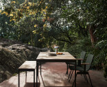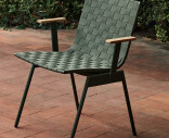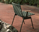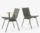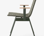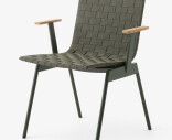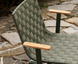 Ville-mallisto juhlistaa ulkoilmaelämää skandinaavisen luonnon inspiroimana. Tuoli on valmistettu jauhemaalatusta teräksestä ja verhoiltu punotulla polyesterivyöllä pehmeyttä ja kehon lämpötilaan sopeutumista varten. Tiikkiset käsinojat tuovat lisämukavuutta.