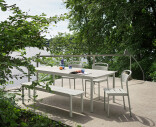 “The Linear Steel Series was designed from the idea of presenting durable materials in a sophisticated and understated expression for outdoor use with its form language inspired by the notion of meetings—the meetings of lines, the meetings of shapes and the meetings of materials. The design is defined by its straight lines for a contemporary yet timeless aesthetic through the details of its folded edges, halfcircular intersecting legs and small spacing for easy outflow of water. It is through these subtle elements that the Linear Steel Series translates the values of elegance, longevity and functionality into modern outdoor furniture.”