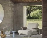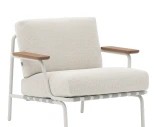 Settle Lounge Chair från Muuto on ulkokäyttöön suunniteltu nojatuoli, jossa yhdistyvät kevyt ja elegantti rakenne. Ilmava teräsrunko luo modernin ilmeen, kun taas FSC™-sertifioidusta sapelemahongista valmistetut käsinojat tuovat luonnollista lämpöä. Säänkestävien tyynyjen ja kestävien materiaalien ansiosta tuoli sopii täydellisesti rentouttaviin hetkiin ulkona.