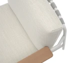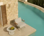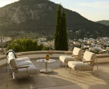 FSC™-sertifioidusta sapelemahongista valmistetut käsinojat pehmentävät metallin selkeitä linjoja ja antavat tuolille lämpimämmän ja kutsuvamman ilmeen. Tyynyt on täytetty nopeasti kuivuvalla vaahtomuovilla ja verhoiltu kestävillä ulkokankailla, mikä takaa pitkäaikaisen mukavuuden ja kestävyyden. Suojaavan päällyksen käyttö on suositeltavaa erityisen vaativissa sääolosuhteissa.