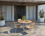 Jauhemaalattu alumiinirunko ei ruostu ja on saatavilla väreissä Taupe ja Noir. Istuinosat ja selkänoja on valmistettu FSC®-sertifioidusta tiikistä – luonnostaan kestävästä puulajista, joka saa ajan mittaan kauniin harmaan patinan. Jos haluat säilyttää puun kullanruskean sävyn, suosittelemme säännöllistä käsittelyä tiikkiöljyllä.
