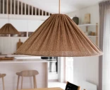 Riippuvalaisimen varjostin Tipi D78 on selkeästi kartionmuotoinen, ja tuo tilaan luonnetta olematta hallitseva. Kankaan meleerattu rakenne kahdessa sävyssä luo elävän pinnan ja tekstiilimäisen tunnun. Vaikka kangas on hieman paksumpaa, se päästää valon läpi tasaisesti ja miellyttävästi.