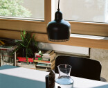 Mustaksi maalattu teräsvarjostin, sisäpinta maalattu valkoinen.