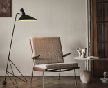 "Tripod from 1953 reflects the clean minimalism of Old Masters Hvidt & Mølgaard. A floor lamp built from lacquered steel with brass details, it strikes a delicate balance between the stark simplicity of its design and the softness injected by the curved edges of its base. Although it was designed in 1953, this is the first time it’s in production."