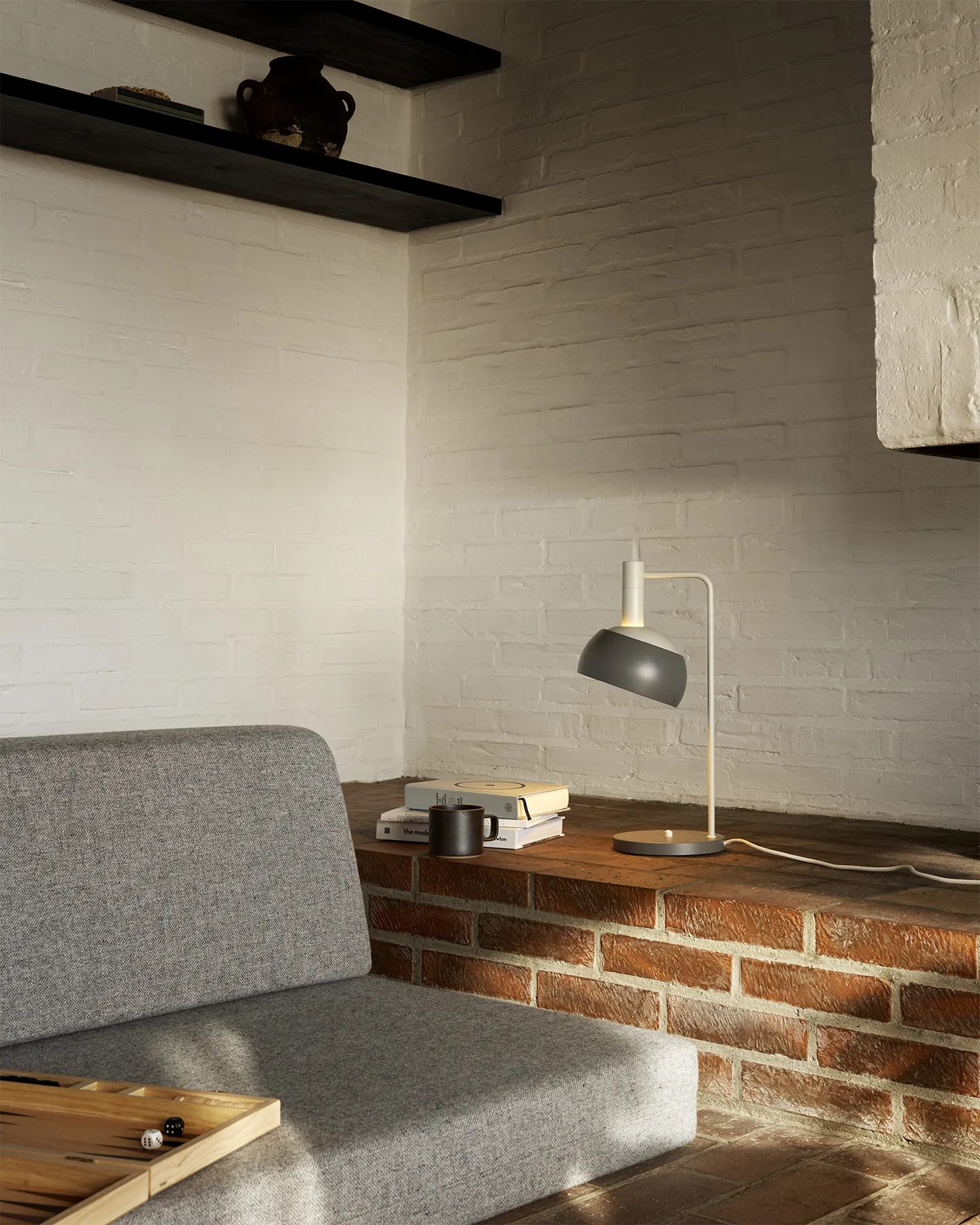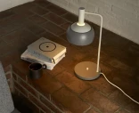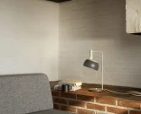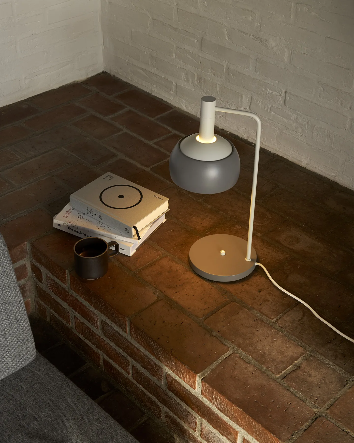 Valaisin perustuu kahden alumiinivarjostimen vuorovaikutukseen, jossa alempi osa voidaan kiertää ylemmän ympäri. Näin valo voidaan suunnata alaspäin tai sivulle, samalla kun varjostimen ja valaisimen rungon välinen aukko päästää ylöspäin hienovaraisen valonvälähdyksen. Lopputuloksena syntyy tasapaino toiminnallisuuden ja tunnelman välillä – täydellinen kirjoituspöydälle, sivupöydälle tai ikkunalaudalle.