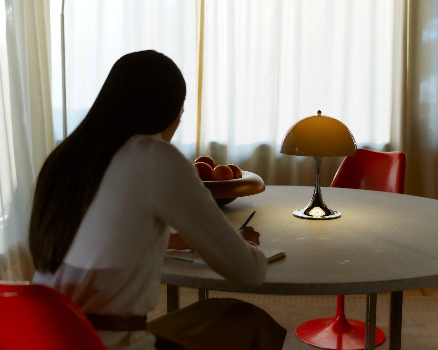 Panthella 250 Portable Originals-väreissä on kannettava pöytävalaisin, joka tuo esiin Verner Pantonin alkuperäisen 1970-luvun väripaletin. Suurempi koko ja tasainen valonjako tekevät valaisimesta monikäyttöisen – se toimii yhtä hyvin tunnelmavalona kuin joustavana työvalona, niin sisällä kuin ulkona.
