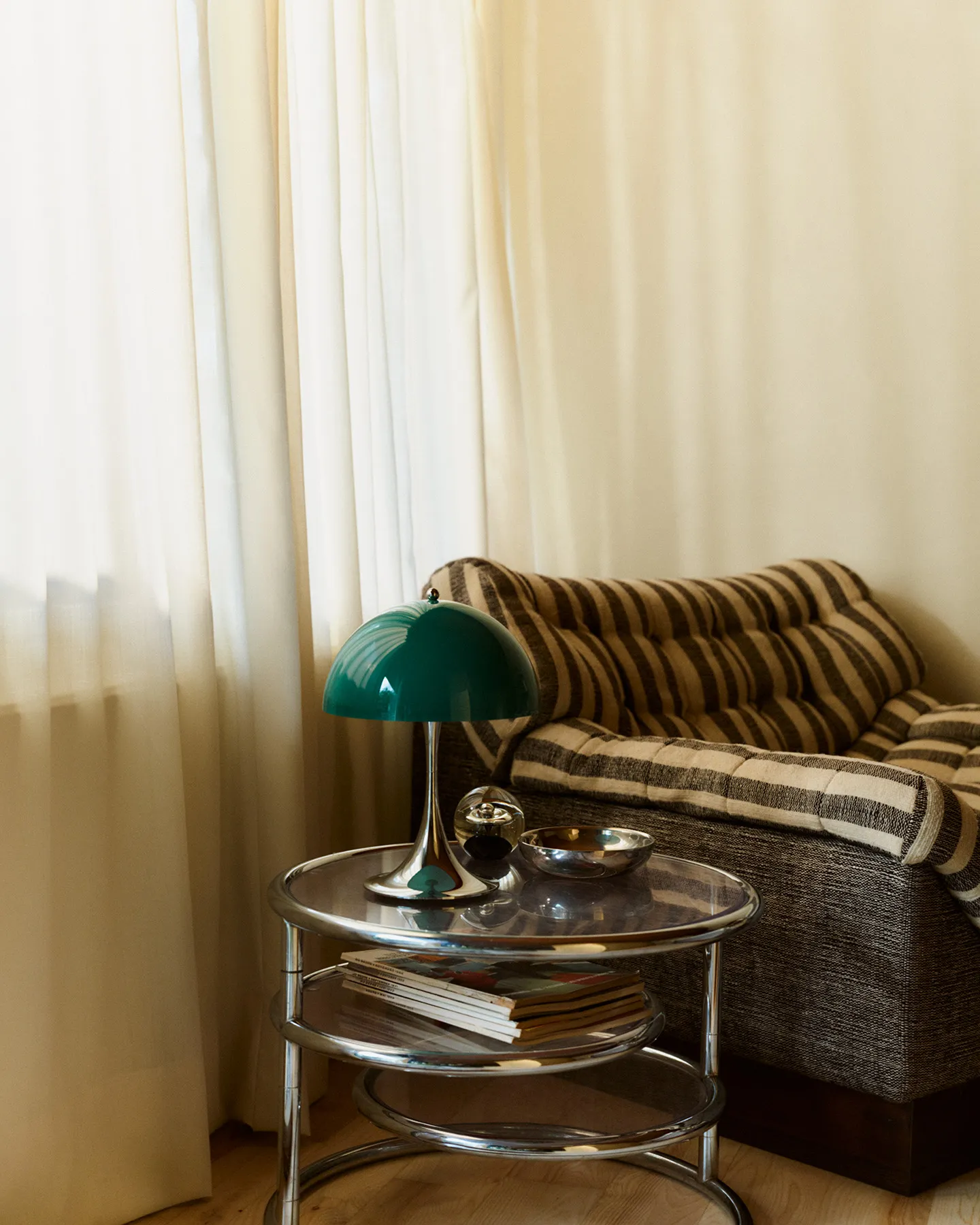 Panthella 250 Portable Originals-väreissä on kannettava pöytävalaisin, joka tuo esiin Verner Pantonin alkuperäisen 1970-luvun väripaletin. Suurempi koko ja tasainen valonjako tekevät valaisimesta monikäyttöisen – se toimii yhtä hyvin tunnelmavalona kuin joustavana työvalona, niin sisällä kuin ulkona.
