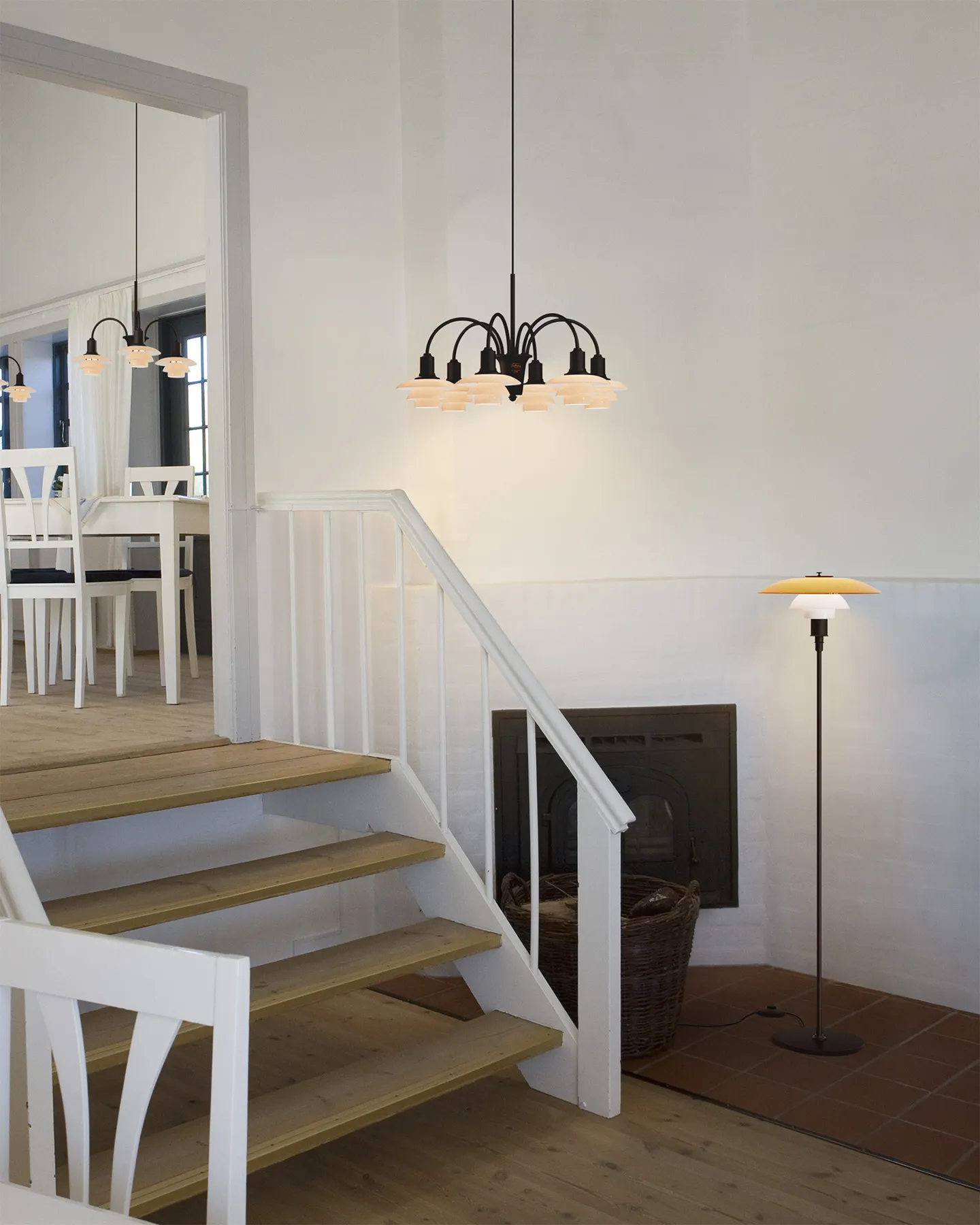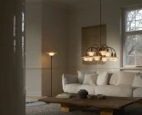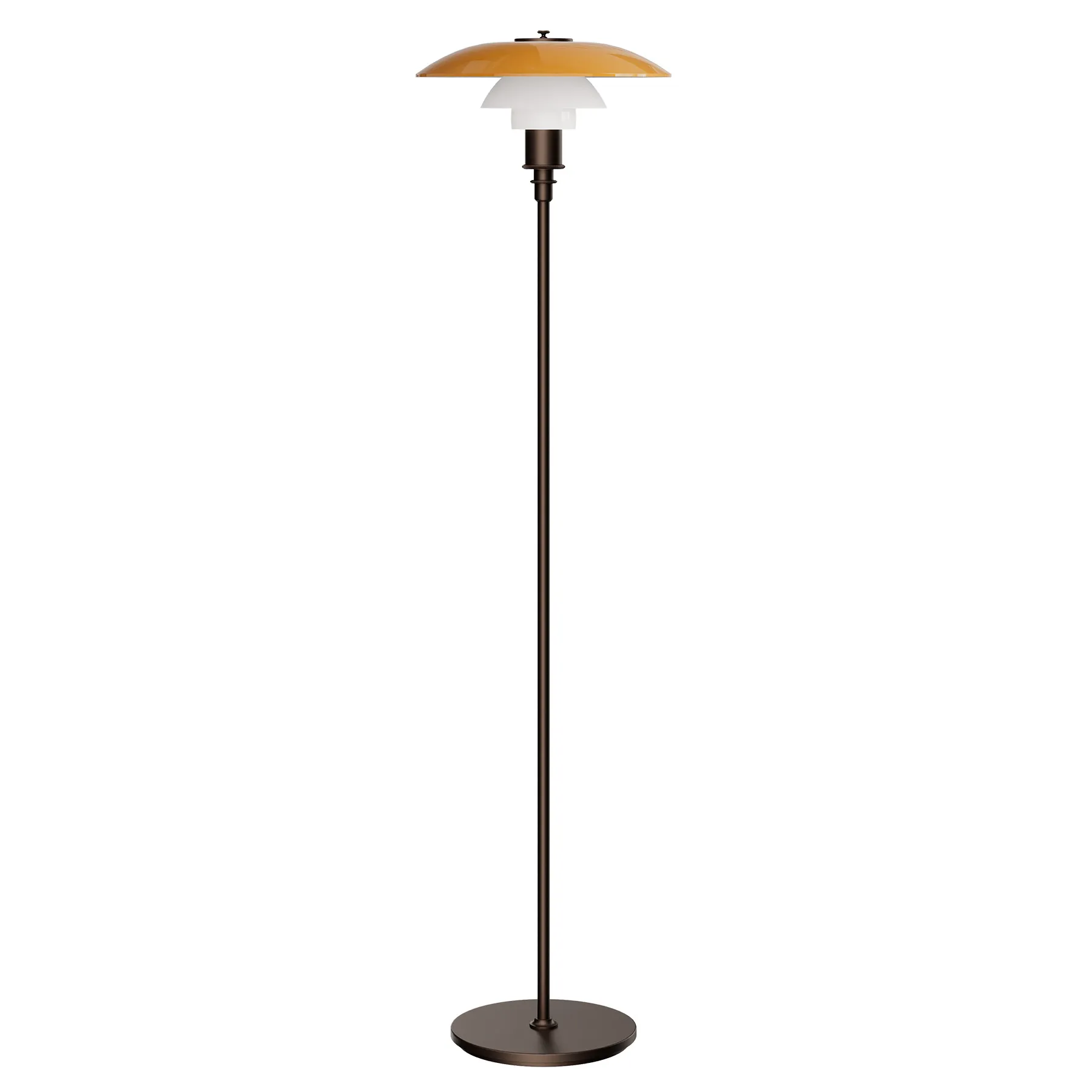 PH 3½-2½ Floor Lamp Centenary Edition pohjautuu Poul Henningsenin PH-järjestelmään – huolellisesti suunniteltuun kolmivarjostinperiaatteeseen, joka kehitettiin tarjoamaan korkeaa valonkäyttömukavuutta monenlaisiin ympäristöihin. Tässä juhlavuoden erikoisversiossa yhdistyvät kolme suupuhallettua lasivarjostinta: nelikerroksinen meripihkanvärinen ylävarjostin, jossa on hiekkapuhallettu valkoinen sisäpinta, sekä kaksi kolmikero ksista valkoista opaalilasista valmistettua alavarjostinta, joissa on hiekkapuhallettu sisäpinta. Yhdessä ne luovat pehmeän ja täysin häikäisemättömän valon: ylävarjostin antaa miellyttävän ylöspäin suuntautuvan hehkun, samalla kun valo ohjautuu hallitusti alaspäin.