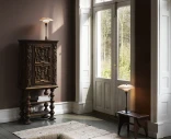 Jalka on harjattupintainen ja patinoitua messinkiä, joka on lakattu säilyttämään elegantin viimeistelynsä aikaa vastaan.