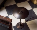 Valaisimen runko on valmistettu patinoidusta messingistä, jossa on hienovaraiset harjatut linjat. Lämmin ja klassinen pinta on lakattu säilyttämään ilmeensä ajan mittaan ja estämään lisäpatinoitumista. Tuloksena on pöytävalaisin, jossa yhdistyvät toiminnallisuus, eleganssi ja selkeä yhteys tanskalaiseen modernismiin.