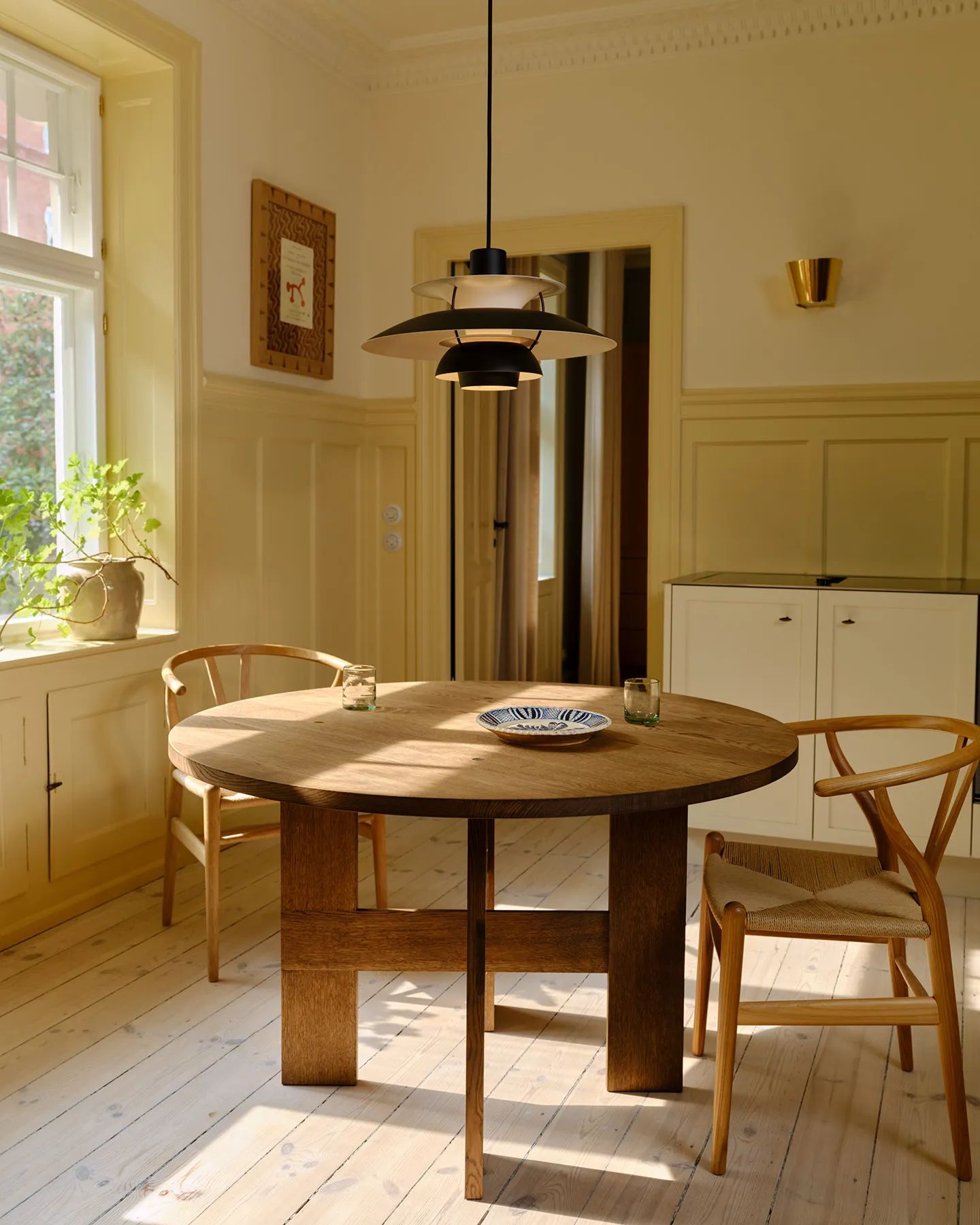 PH 5 Black Edition perustuu Poul Henningsenin legendaariseen kolmivarjostinjärjestelmään, joka on suunniteltu tuottamaan täysin häikäisemätöntä ja pehmeää valoa. Mattamusta lakkaus korostaa valaisimen veistoksellista muotoa, kun taas viininpunaiset ja vaalean roosat yksityiskohdat tuovat siihen lämpöä ja modernia ilmettä.