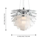 Version 4 (V4#): PH Artichoke toimitetaan nyt päivitettynä mallina, jossa ripustusratkaisu on yhtenäinen eri kokojen välillä. Kattokuppi mahdollistaa kaapelin sivusyötön. Vaijerilukitus mahdollistaa vaijerin pituuden säätämisen ilman vaijerin katkaisemista.