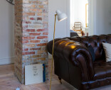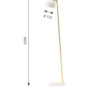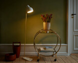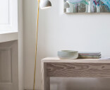 Materiaali: Jalusta painevalettua alumiinia, varjostin kehrättyä alumiinia, pulverimaalattu mattavalkoinen. Valaisinvarsi harjattua messinkiä. Huomaa, että messinkisiä pintoja ei ole käsitelty. Tämä tarkoittaa sitä, että pinta muuttuu ja patinoituu ajan mittaan.