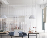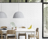 “Under The Bell is more than just a lampshade—when situated over a table or in an open space, the bell-shaped light creates its own space within the environment. As such, the design embraces and shelters the people underneath, both in a physical and abstract manner, for an intimate atmosphere. The design is made using fibers from recycled plastic bottles that, along with its unique shape, enables Under The Bell to absorb sound and improve the acoustics of any room.”