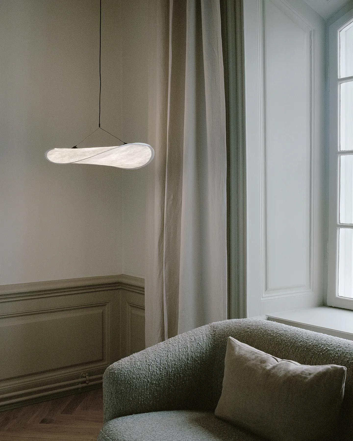 Tense Pendant Ø55 on Panter & Tourronin suunnittelema riippuvalaisin. Ohut Tyvek-varjostin levittää pehmeää ja tasaista valoa, ja sen ilme on keveä ja leijuvan oloinen. Harkittu valaisin pienempiin tiloihin, joissa valo saa olla läsnä ilman että kokonaisuus tuntuu raskaalta.
