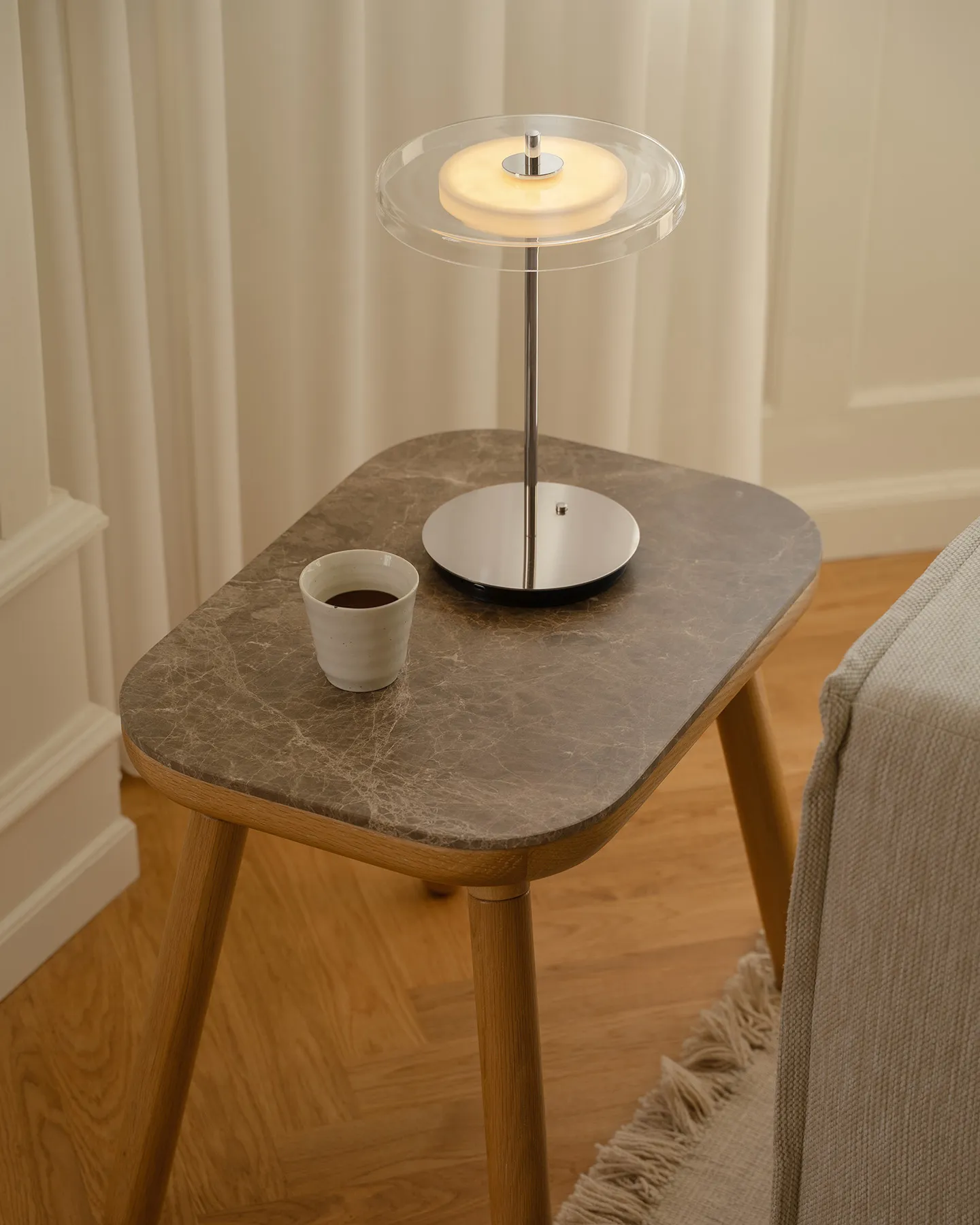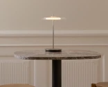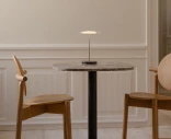 Läpinäkyvä lasikupu ympäröi lampun keskiosan ja luo lähes leijuvan vaikutelman. Koska valaisin on ladattava ja johdoton, sitä on helppo siirtää kodin eri tiloihin. Valittavana on kiillotettu messinki tai teräs – viimeistelyt, jotka täydentävät monenlaista sisustustyyliä.