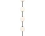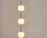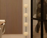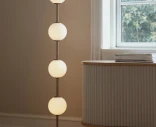 Lampun yläosassa oleva musta painike mahdollistaa valon kirkkauden säätämisen tunnelman ja tarpeen mukaan. Teräksen ja lasin yhdistelmä luo hillityn ja elegantin ilmeen – kuin hohtavat helmet vertikaalisessa liikkeessä.