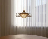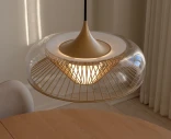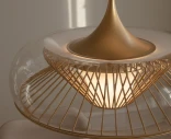 Chordis-varjostin UMAGElta on elegantti yhdistelmä lasia ja messinkiä, jossa ilmava muotoilu luo lähes leijuvan vaikutelman. Hienovaraiset yksityiskohdat ja kauniisti kaartuvat lasimuodot sulautuvat yhteen koristeellisten messinkielementtien kanssa, tehden siitä tyylikkään lisän sekä ruokailu- että olohuoneeseen.