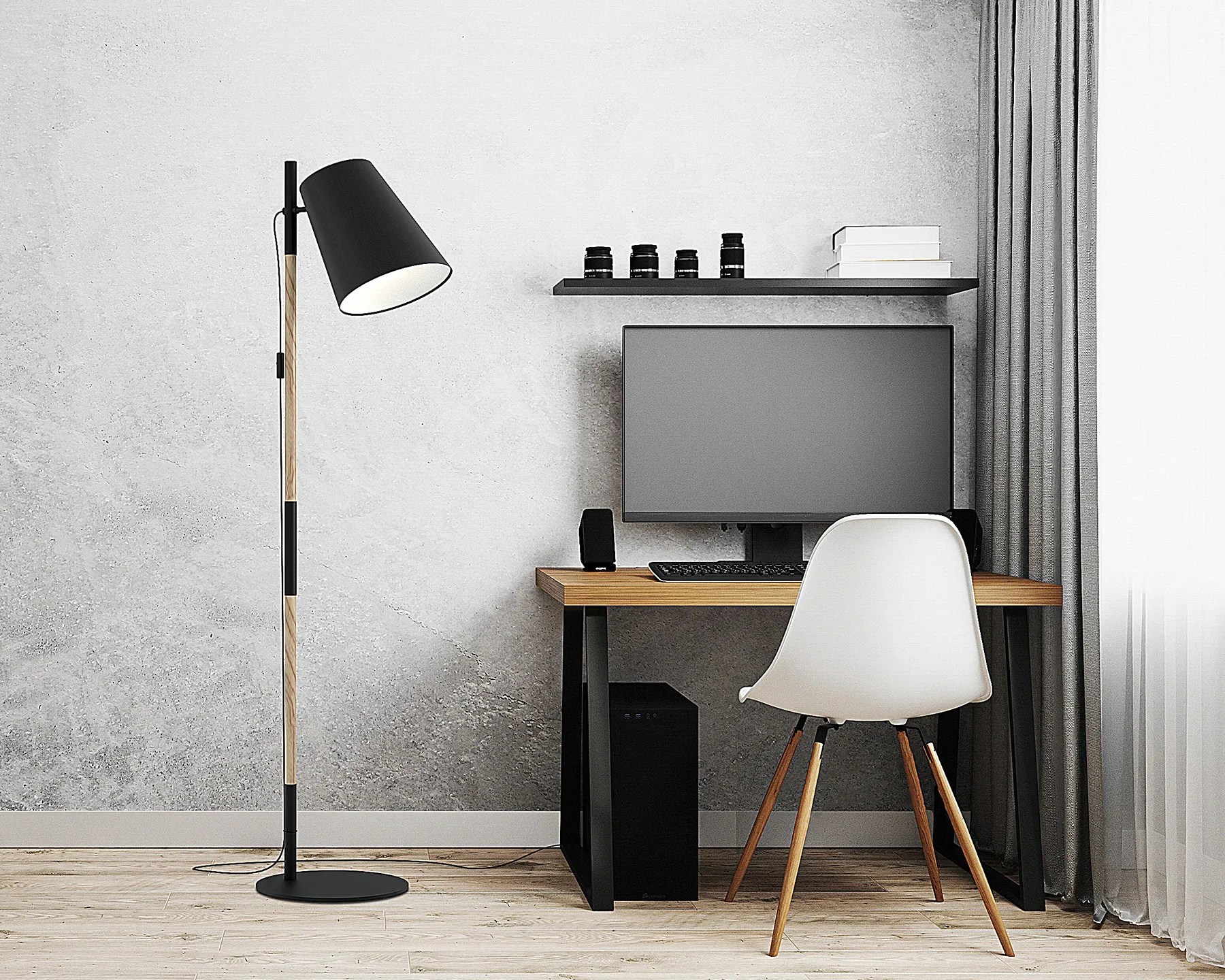 Finder on lattiavalaisin, jossa on siro siluetti ja säädettävä varjostin, joka tarjoaa kohdistettua ja toiminnallista valoa. Metallin, puuyksityiskohtien ja tekstiilivarjostimen yhdistelmä luo rauhallisen ilmeen, joka sopii sekä olohuoneeseen että työympäristöihin.