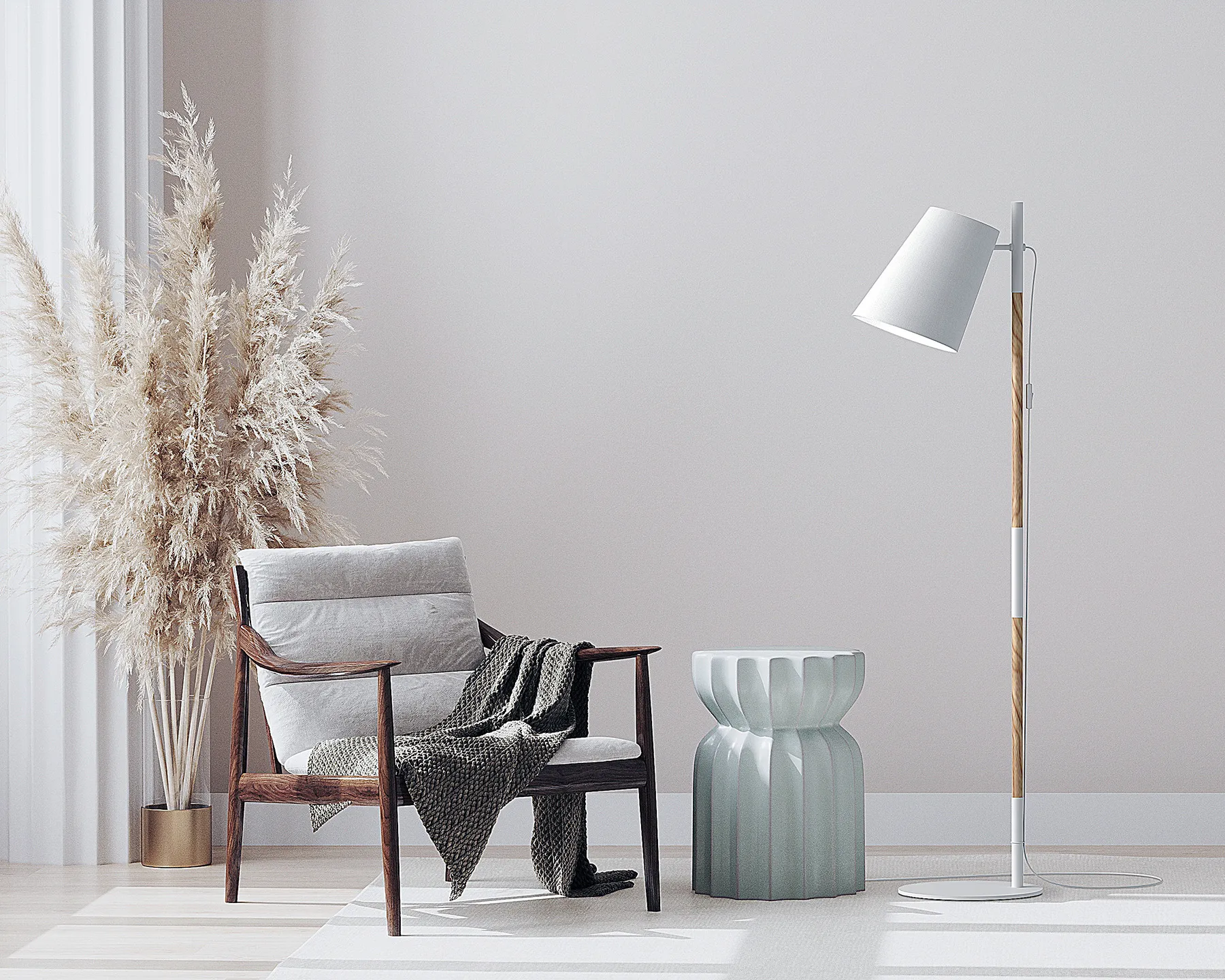 Säädettävä varjostin mahdollistaa valon suuntaamisen juuri sinne, missä sitä tarvitaan – lukutuolin viereen, sohvan äärelle tai lisävalaistukseksi huoneeseen. Tekstiiliverhoiltu varjostin on vaihdettavissa tarpeen mukaan. Valaisimessa käytetään tavallista E27-lamppua, joten valon voimakkuus ja sävy on helppo valita oman mieltymyksen mukaan. Virtakytkin sijaitsee johdossa, lähellä jalustaa, mikä tekee käytöstä vaivatonta arjessa.