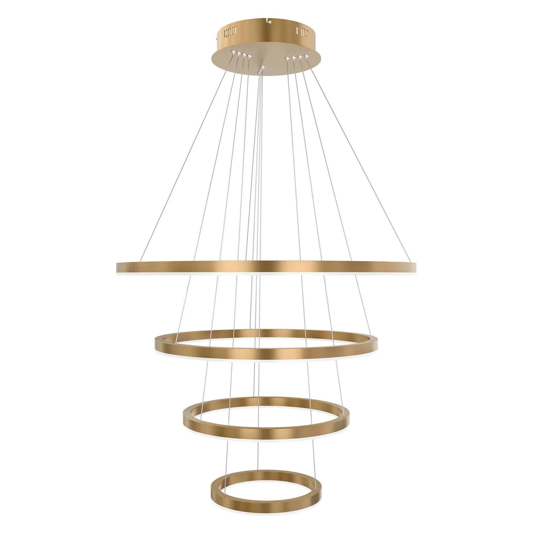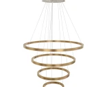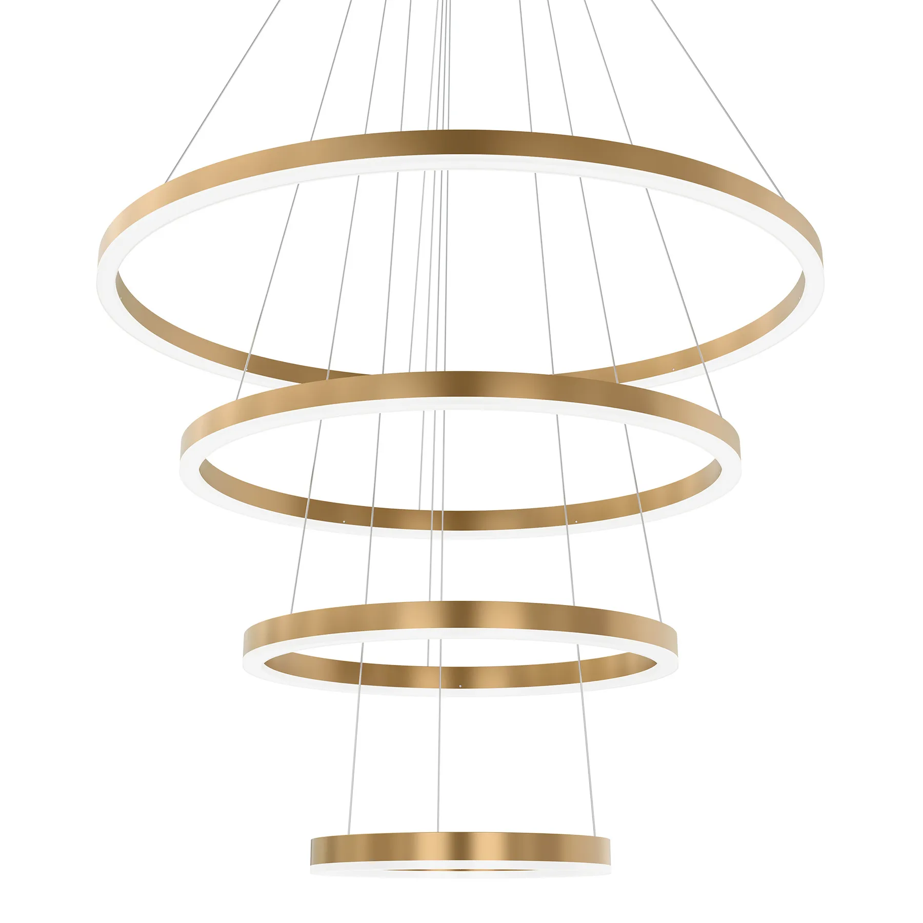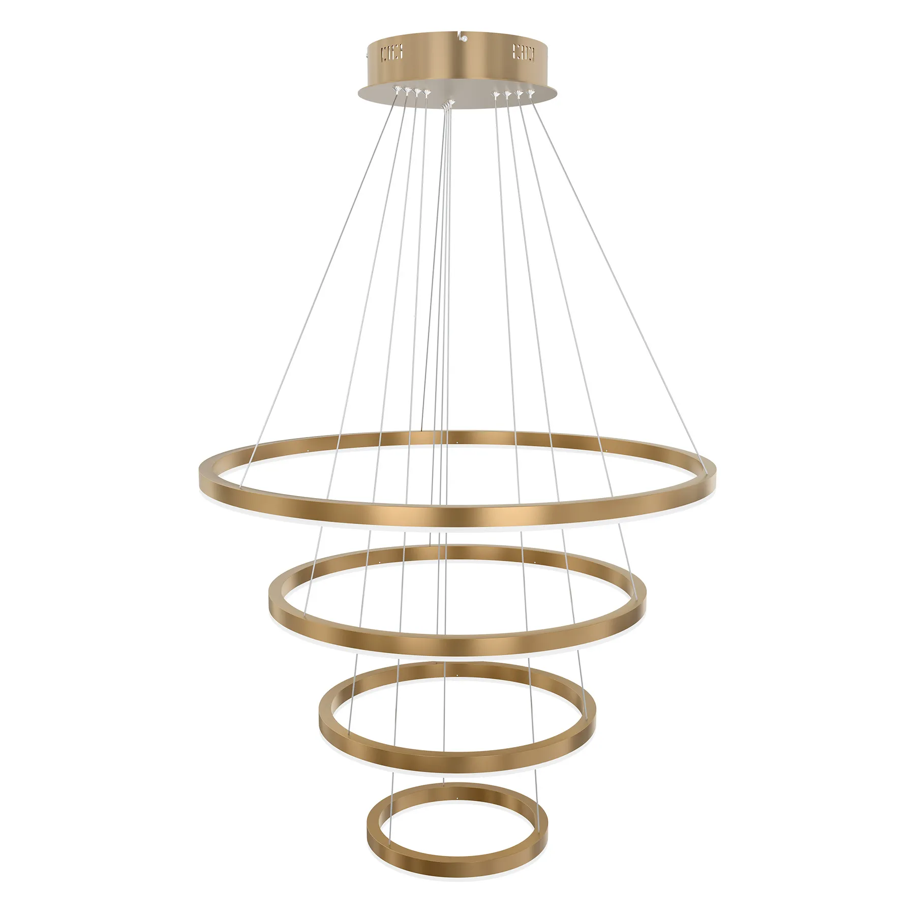 Valaisin Grönlundin Layer 4 -riippuvalaisin koostuu neljästä valorenkaasta, joiden halkaisijat ovat 80, 60, 45 ja 30 cm. Renkaat on sijoitettu eri korkeuksille, mikä luo kerroksellisen vaikutelman ja lisää valokuvioon tilantuntua ja rakennetta.